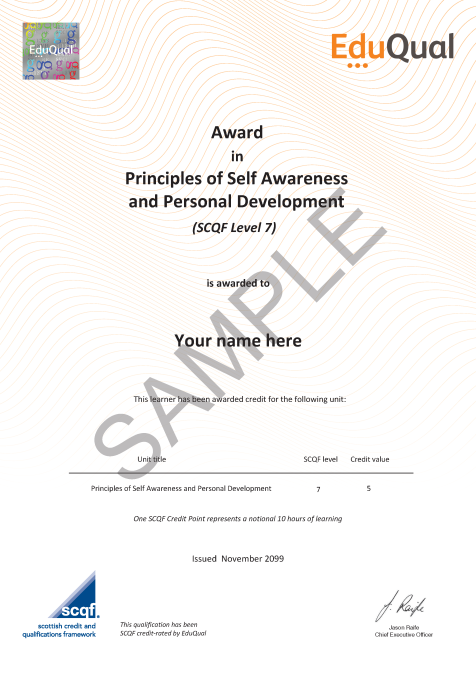 Award in Principles of Self Awareness and Personal Development (SCQF Level 7)